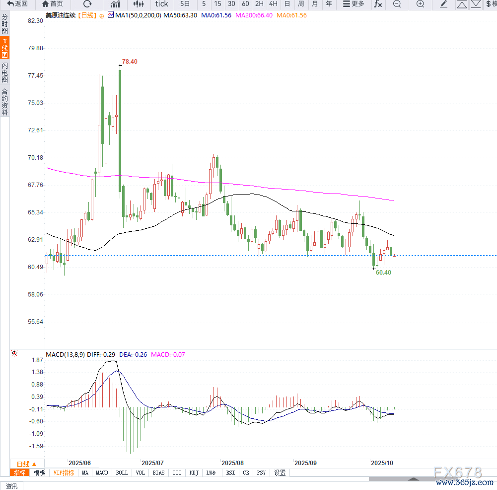 从本事图形来看,WTI日线披露价钱自9月中旬高点67.40好意思元/桶以来捏续走低,现在驱动在61好意思元相沿区拆开壁。K线形式不竭管出小阴线,反应出商场在低位轰动整理,买盘意愿不及。